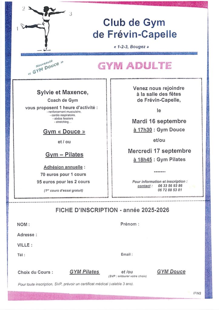 Les cours de Gymnastique se déroulent le mardi à 17h30 pour la « Gym Douce » et le mercredi à 18h45 pour la « Gym Pilates » dans la Salle des Fêtes de Frévin-Capelle.